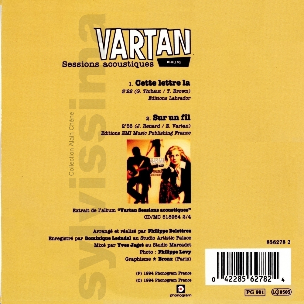 CatégoriePhonogram Cette lettre-là 856 278-2 France Ⓟ 1994 Légende couleurs : Chanson originale écrite pour Sylvie Vartan → Droits d'auteur : (Compositeur-s / Parolier-s) ____________ Cette lettre-là (T.Brown / G.Thibaut ) Version acoustique Sur un fil (E.Vartan / J.Renard) Version acoustique Recto Label Verso ▼ ▼ ▼