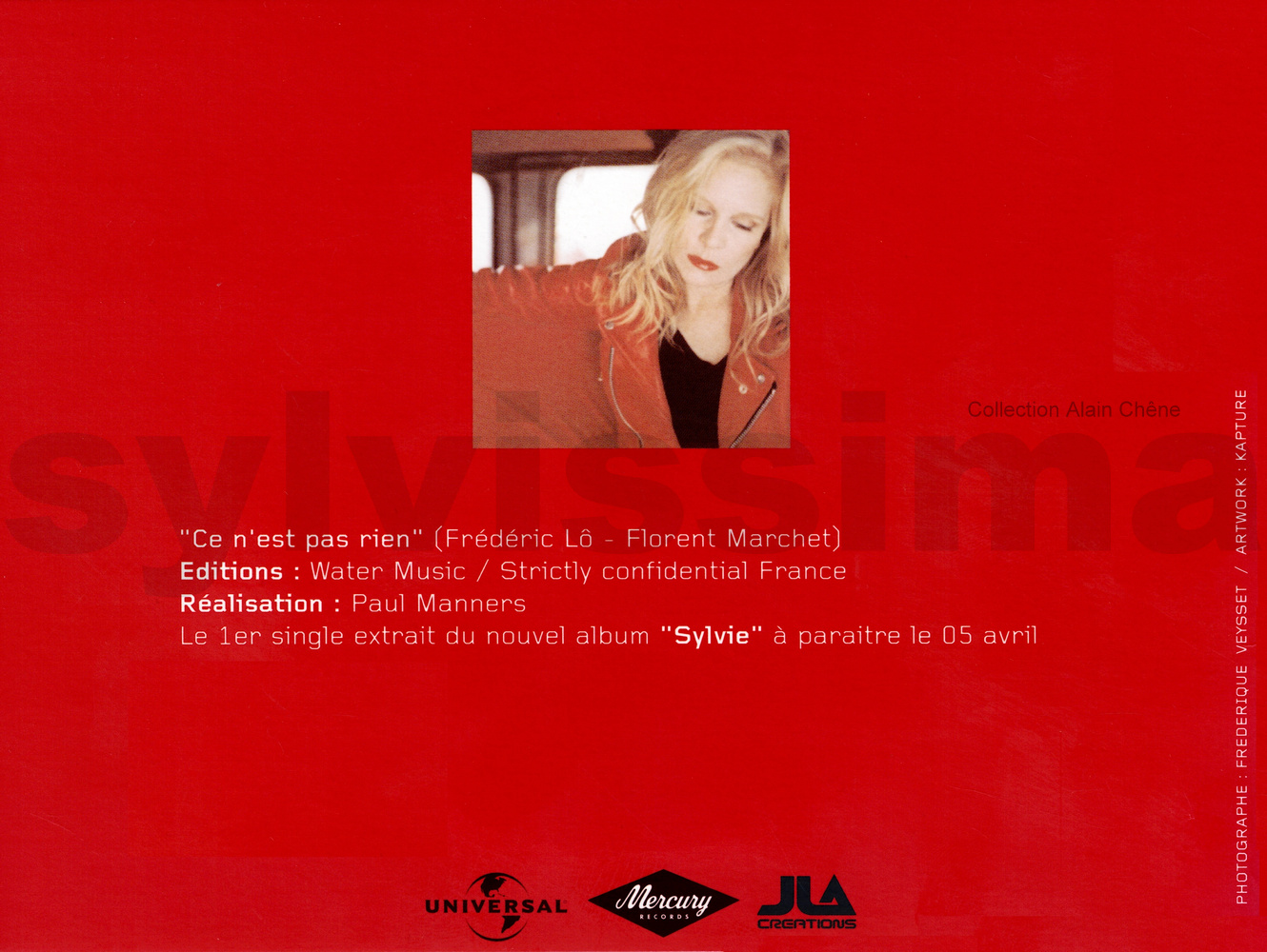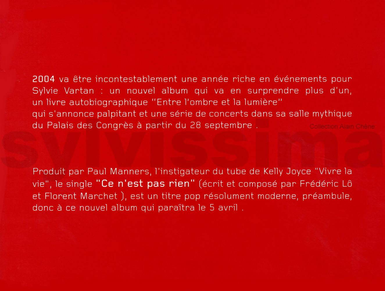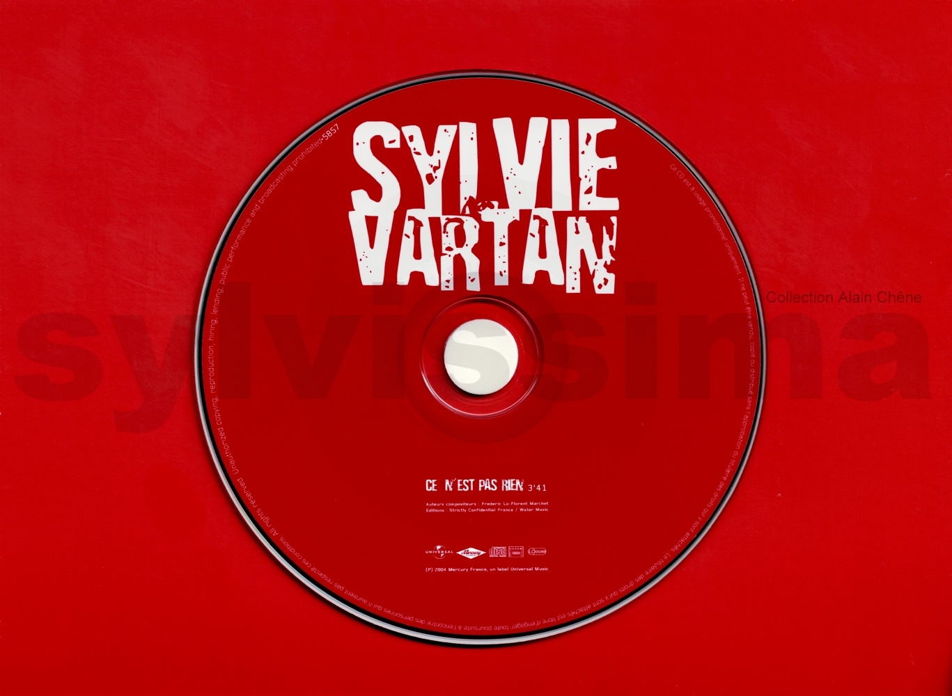 CatégoriePhonogram Plan promo "Ce n'est pas rien" 5857 France Ⓟ 2004 CDS Promo Légende couleur : Chanson originale écrite pour Sylvie Vartan → Droits d'auteur : (Compositeur-s / Parolier-s) ____________ 1- Ce n'est pas rien (F.Lo/F.Marchet) Recto Verso ▼ ▼ Intérieur gauche Intérieur droit + label ▼ ▼