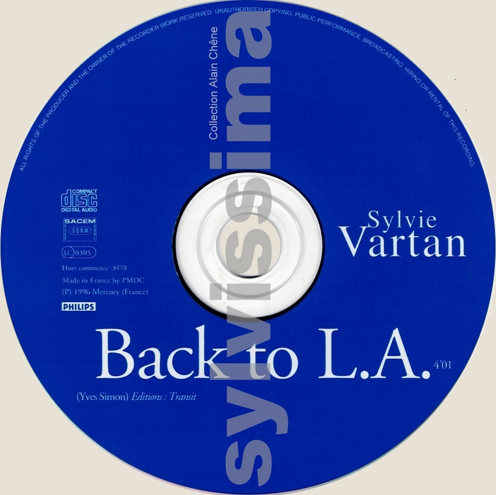 CatégoriePhonogram Back to L.A. 3478 France Ⓟ 1996 CDS Promo Légende couleurs : Chanson originale écrite pour Sylvie Vartan → Droits d'auteur : (Compositeur-s / Parolier-s) ____________ 1- Back to L.A. (Y.Simon/Y.Simon)) Recto Label Verso ▼ ▼ ▼