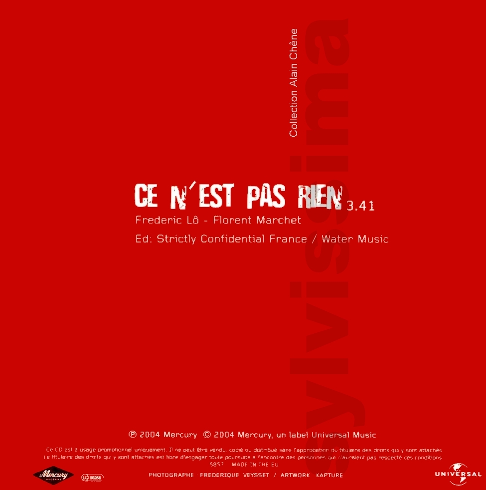 CatégoriePhonogram Ce n'est pas rien 5857 France Ⓟ 2004 CDS Promo Légende couleur : Chanson originale écrite pour Sylvie Vartan → Droits d'auteur : (Compositeur-s / Parolier-s) ____________ 1- Ce n'est pas rien (F.Lo/F.Marchet) Recto Verso Label ▼ ▼ ▼