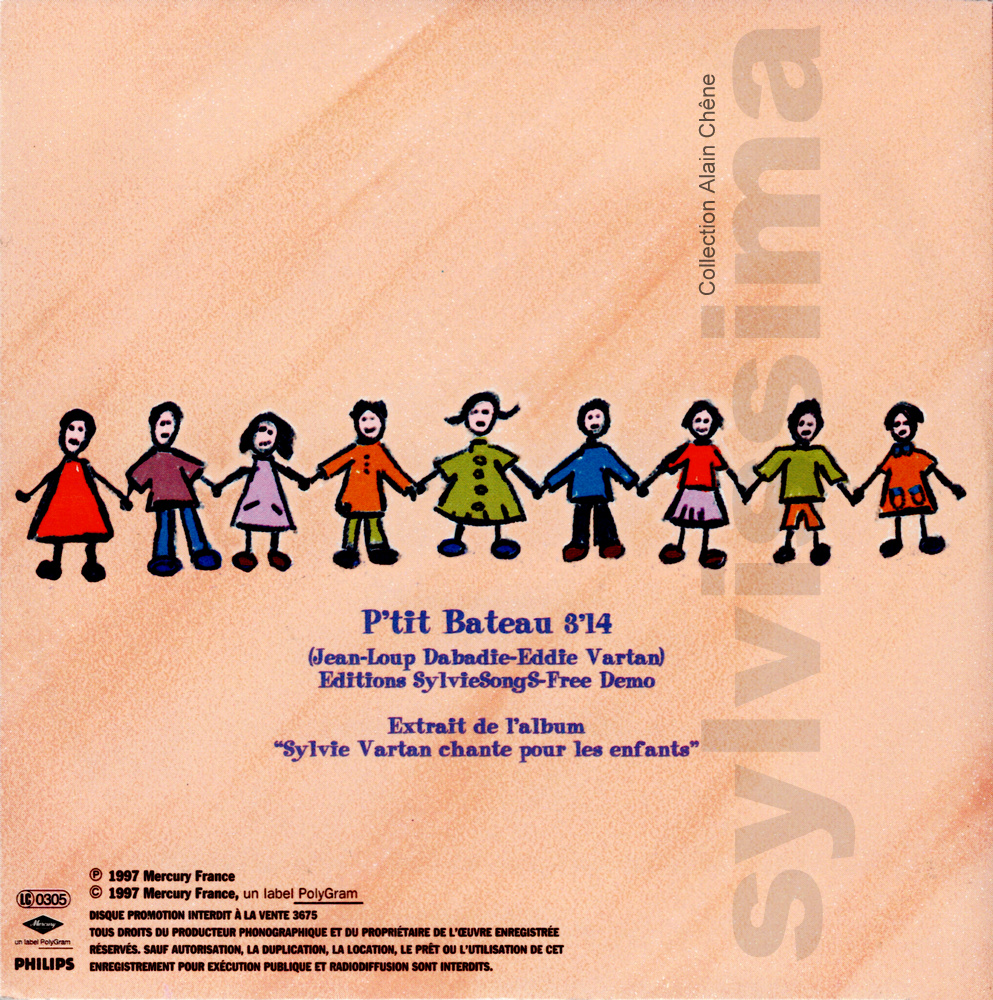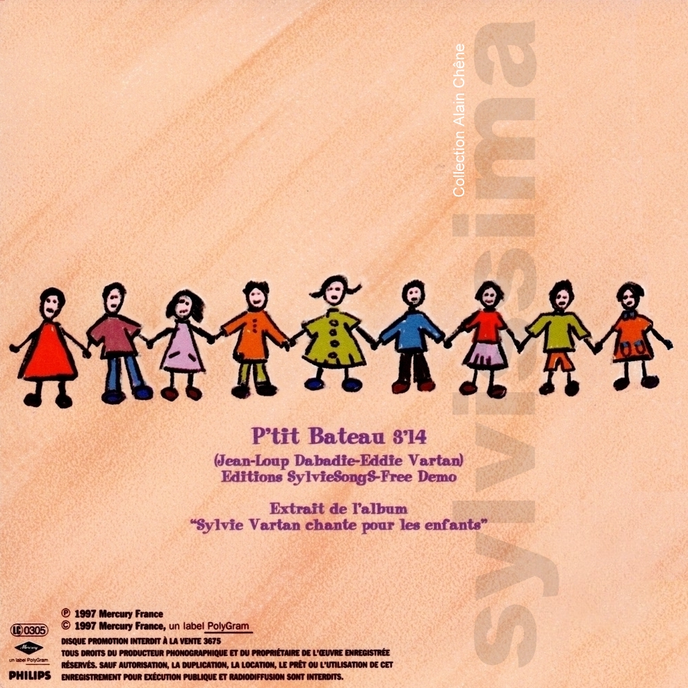 CatégoriePhonogram P'tit bateau 3675 France Ⓟ 1997 CDS Promo Légende couleurs : Chanson originale écrite pour Sylvie Vartan → Droits d'auteur : (Compositeur-s / Parolier-s) ____________ 1- P'tit bateau (E.Vartan/J.L.Dabadie) Recto Verso Label ▼ ▼ ▼ ▼ Variante recto: lettres bleues ▼ Recto Verso ▼ ▼