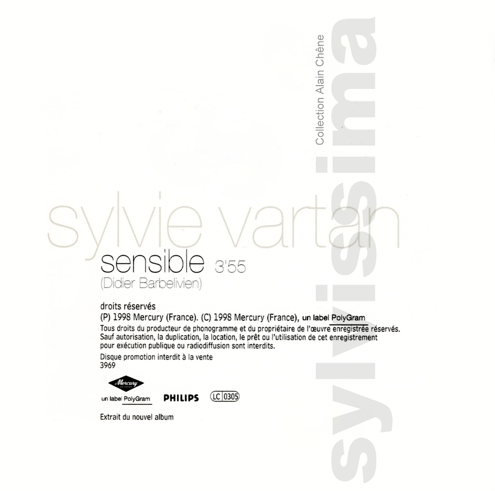 CatégoriePhonogram Sensible 3969 France Ⓟ 1998 CDS Promo Légende couleurs : Chanson originale écrite pour Sylvie Vartan → Droits d'auteur : (Compositeur-s / Parolier-s) ____________ 1- Sensible (D.Barbelivien/D.Barbelivien) Recto Verso Label ▼ ▼ ▼