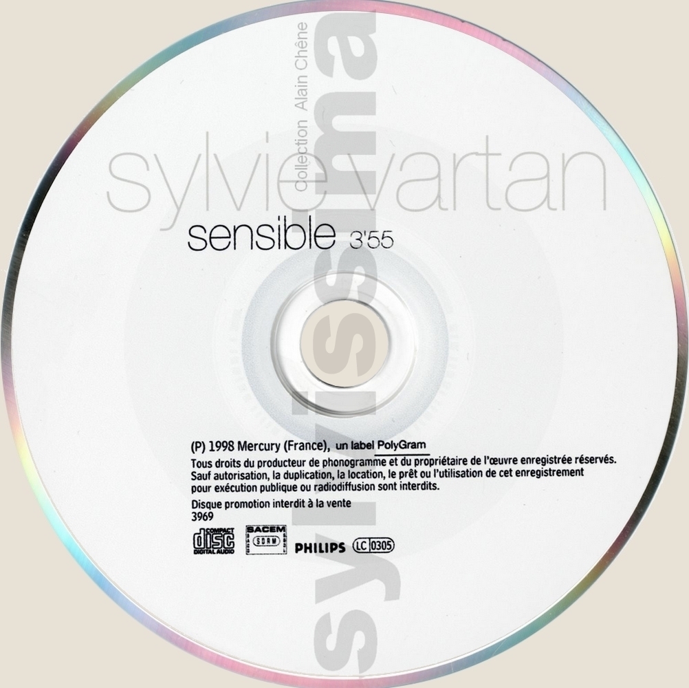 CatégoriePhonogram Sensible 3969 France Ⓟ 1998 CDS Promo Légende couleurs : Chanson originale écrite pour Sylvie Vartan → Droits d'auteur : (Compositeur-s / Parolier-s) ____________ 1- Sensible (D.Barbelivien/D.Barbelivien) Recto Label Verso ▼ ▼ ▼